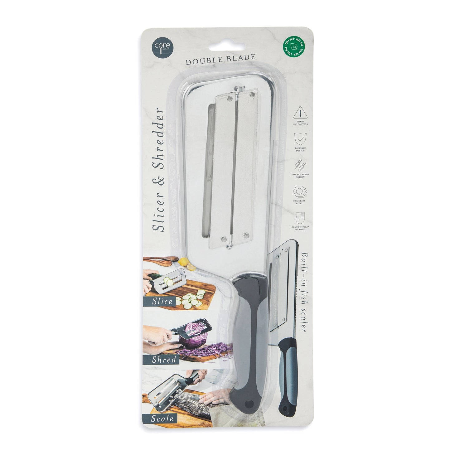 A kitchen essential! The Core Kitchen Double Blade Slicer and Shredder is extremely versatile. Use the wide blades for larger vegetables and angled blades for thin, even slices. Rounded edges for added safety. Built-in fish scaler. Comfort grip handle.