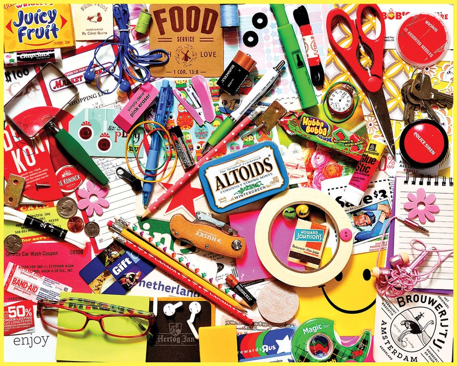Everyone has a catch-all drawer in the kitchen. A drawer where all random things to go die but is the first place you look when you need something. Pens, scissors, takeout menus, and more. Designer Charlie Girard opens his junk drawer for you in this 1000 piece collage style jigsaw puzzle. What’s in your junk drawer?